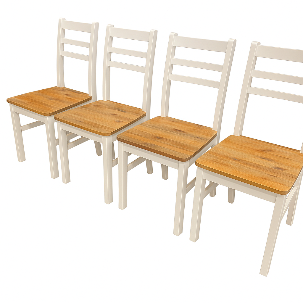 Fyra stabila och bekväma köksstolar i trä med vitmålad stomme och sits i träEn stilren och tidlös design som passar lika bra i det moderna köket som i ett lantligt hem.Stolarna är i mycket gott skick med endast mindre bruksspår.