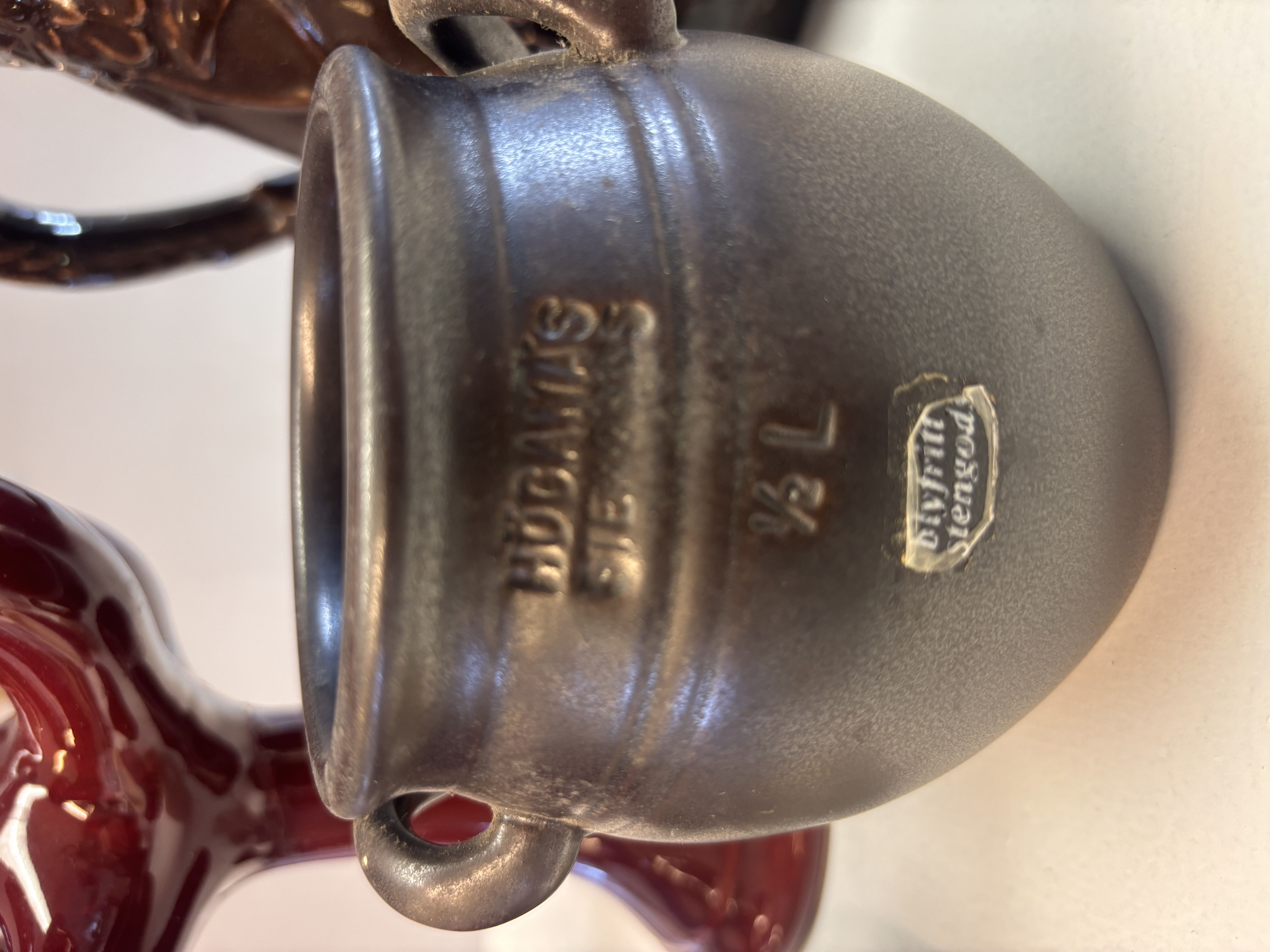 Två glaserade ljusstakar i stengods, en röd och en brun
