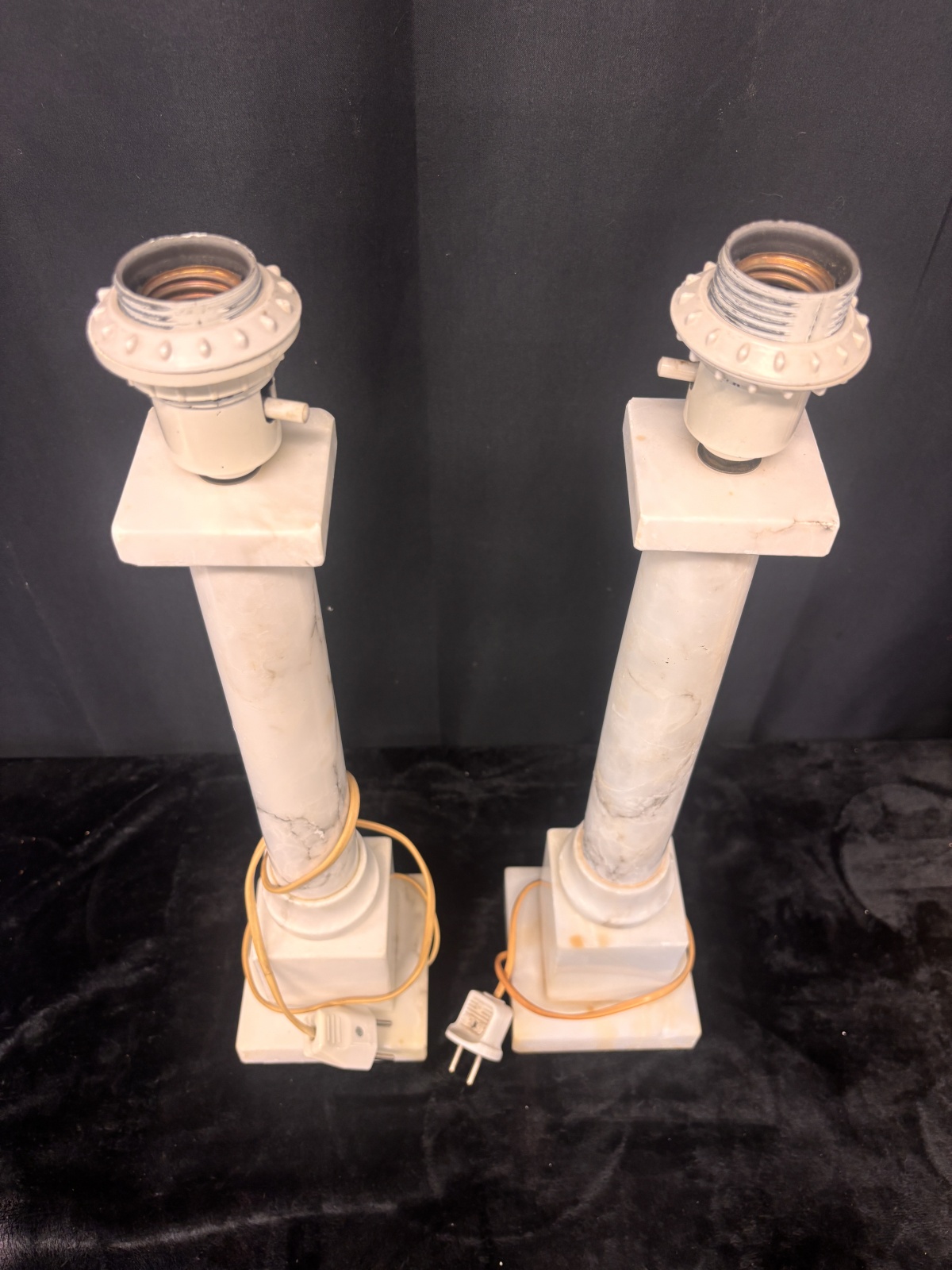 Ett dekorativt par lampfötter tillverkade i marmor eller marmorimitation i en varm ljus ton med naturlig ådring. Formen är inspirerad av antika kolonner med fyrkantig bas och topp.Ljusuttag för glödlampa upptill, med äldre elkontakter.