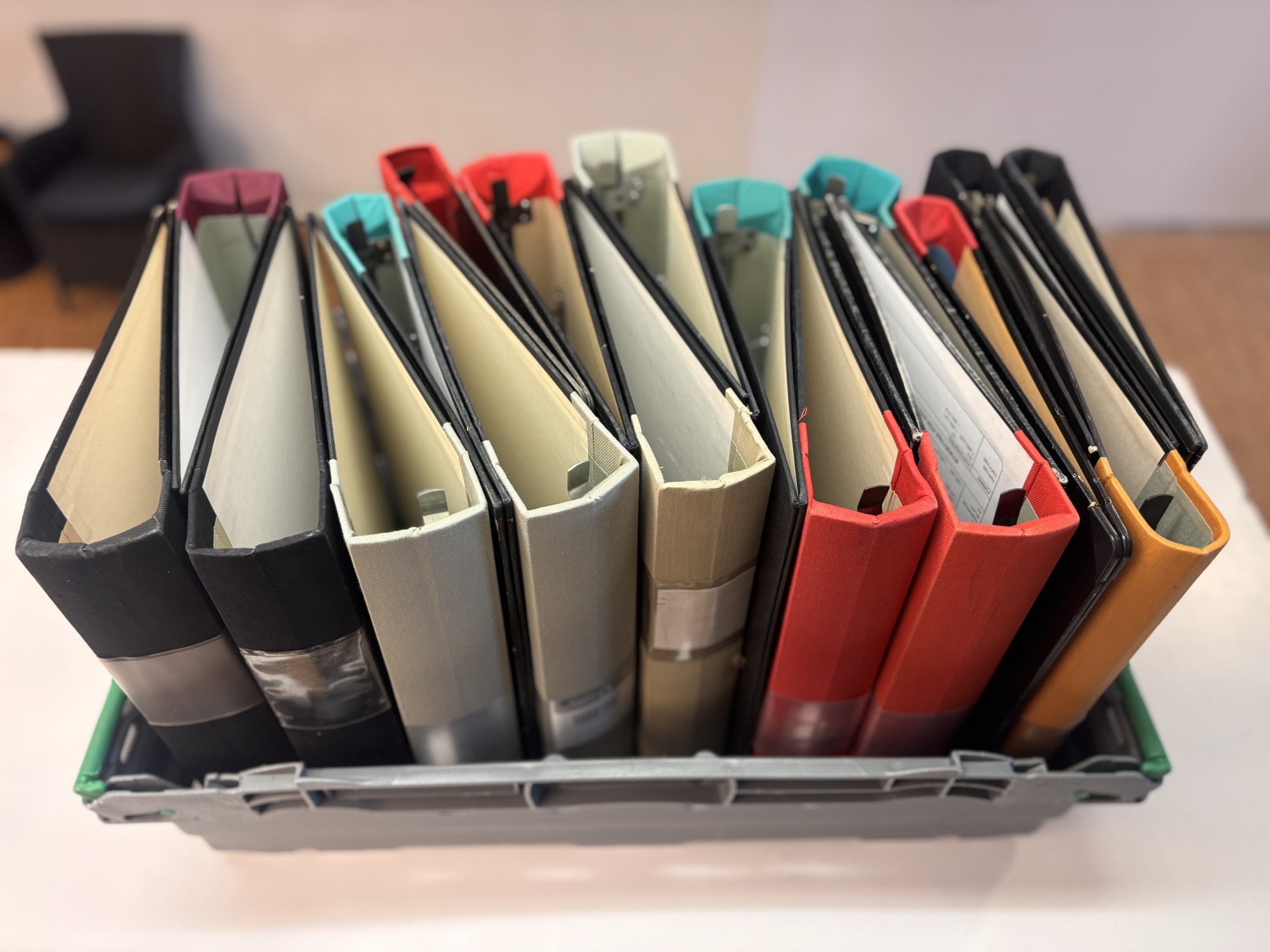 Parti med pärmar i olika färger och storlekar, cirka 12 stycken, levereras i grå plastback.Perfekta för kontor, samlingar eller arkivering. Blandade färger såsom blå, grå och svart.Pärmarna är i begagnat men fullt användbart skick.