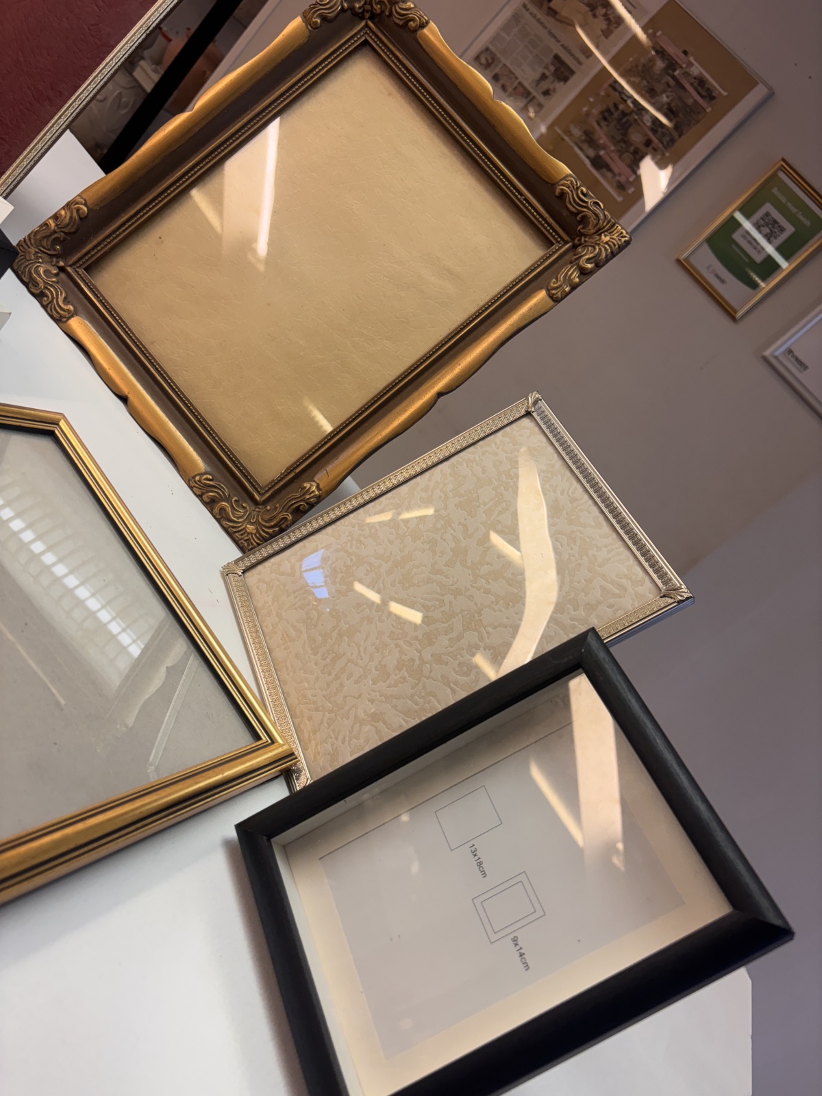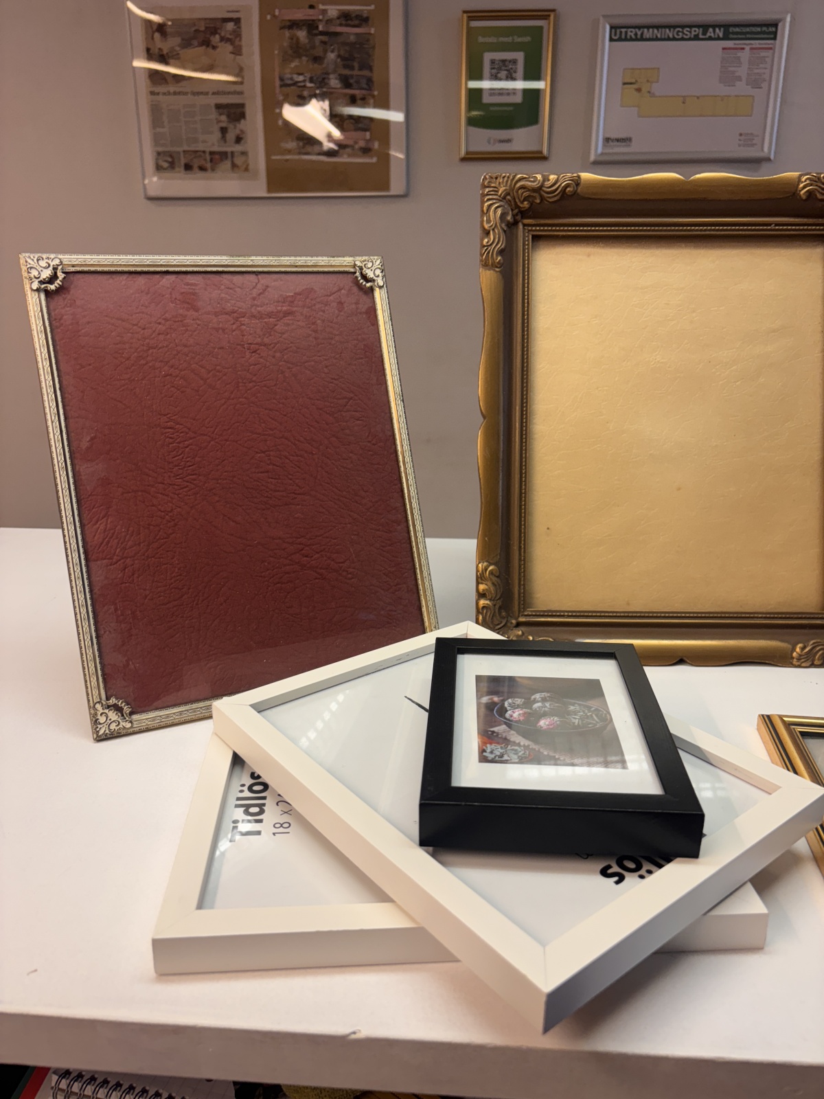 Blandat parti med fotoramar i olika stilar och storlekar.Innehåller både moderna ramar i svart och vitt samt äldre ramar med dekorativ guldfinish.