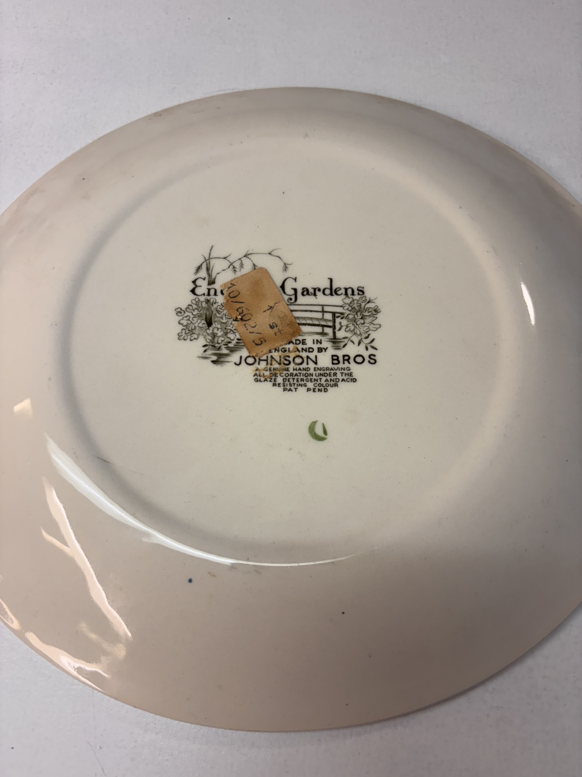 Dekorativ tallrik från Johnson Bros, England. Motiv med bro över damm och rik blomsterprakt i mjuka nyanser. Mönstret heter English Gardens och är ett exempel på Johnson Bros klassiska handgraverade underglaserade dekorer. Märkt undertill.