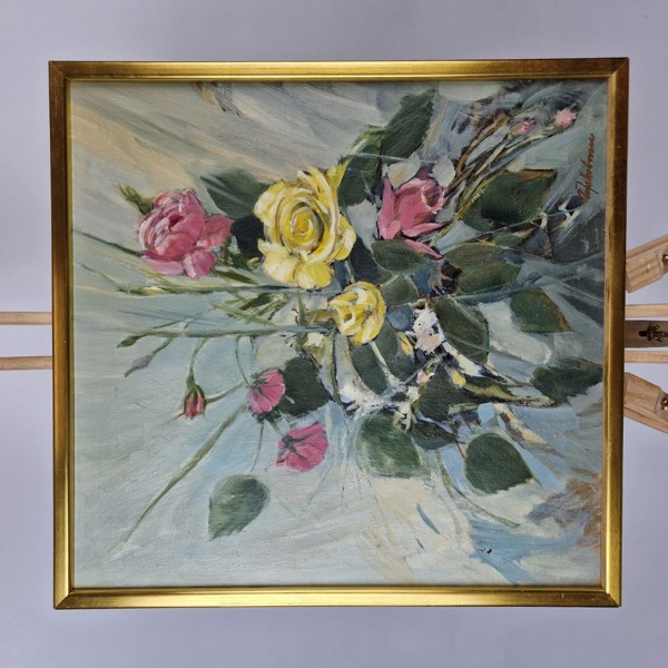 Olja på duk, motiv med blomsterbukett, oidentifierad konstnär. Rammått 44 x 46 cm.