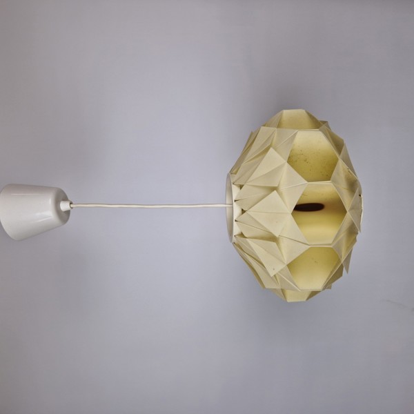 Taklampa, vit, rotting och tyg, 1900-talets andra hälft, ⌀ 40 cm.
