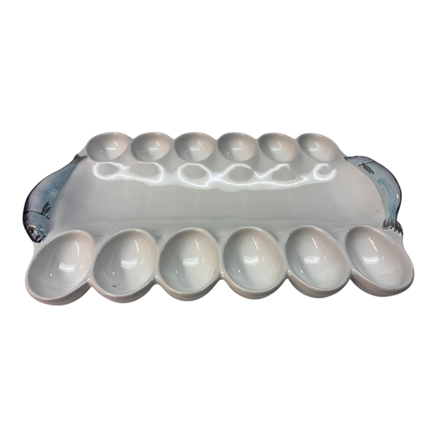 Charmigt serveringsfat i porslin, dekorerat med två fiskar i blå toner på vardera kortsida. Fatet har plats för 12 halvor ägg och en mittdel för tillbehör.