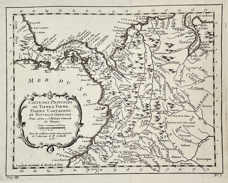 This topographical work is an engraved Map of the Provinces of Tierra Firme, Darien, Cartagena, and New Granada. The map covers the strategic Isthmus of Panama, the northern coast of South America, and the interior regions that roughly correspond to present-day Panama, Colombia, and parts of Venezuela. The title cartouche notes that it was drawn from the best maps, particularly the map of America by D'Anville, and that it was made to accompany a historical work. It depicts colonial administrative divisions, numerous settlements, rivers, and mountain ranges. This map was published in the Histoire Générale des Voyages by Antoine François Prévost or a subsequent Bellin work like Le Petit Atlas Maritime.