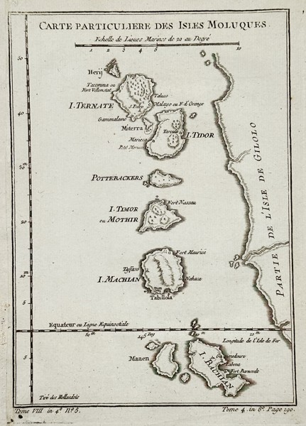 This engraving is a detailed map of the Molucca Islands (Maluku Islands) in Indonesia. It charts the coastline of the "Isle de Gilolo" (Halmahera) and the adjacent islands of Ternate, Tidor, Machian, and Bachian, noting the path of the equator. The map was published in Volume 8 of the monumental 18th-century travel collection, Histoire Générale des Voyages.