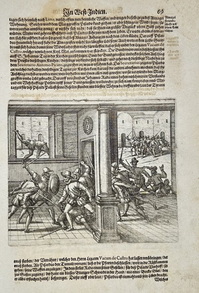 This engraving depicts a battle scene in Calicut, India, between Portuguese soldiers, led by Vasco da Gama, and the local inhabitants. The illustration is page 69 from Part II of the Petits Voyages (Small Voyages), a collection chronicling European expeditions to the East Indies.