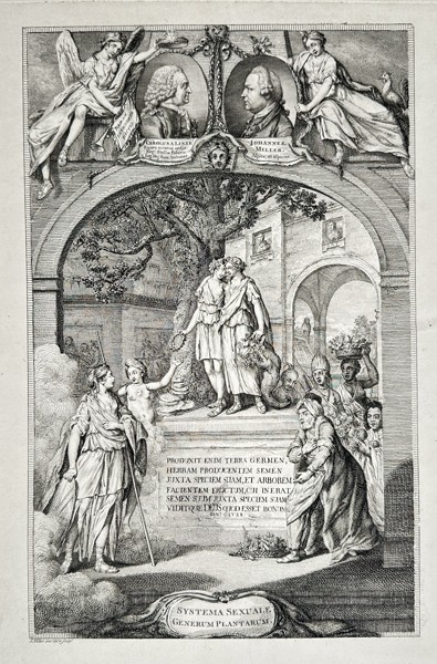 This large folio engraving serves as the elaborate allegorical frontispiece to John Miller's influential work, An Illustration of the Sexual System of Linnaeus (Illustratio Systematis Sexualis Linnaei). The composition features medallion portraits of Carl Linnaeus and the author, John Miller, supported by allegorical figures. Below, a central scene depicts figures representing the male and female aspects of plants, illustrating Linnaeus's classification system based on plant sexual characteristics. Figures representing science and nature flank a Latin inscription.