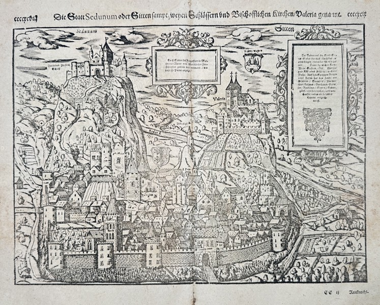 This large woodcut provides a detailed bird's-eye topographical view of the city of Sion (Sitten in German), the capital of the canton of Valais in Switzerland. The view prominently features the city nestled in the Rhône valley, dominated by the two fortified hills: Valère, crowned by the Basilica of Valeria, and Tourbillon, topped by the ruins of the Bishop's castle. The print details the city walls, major buildings, and the surrounding mountainous landscape. This view was published in Sebastian Münster's monumental 16th-century work, Cosmographia.