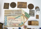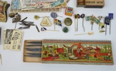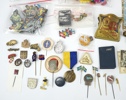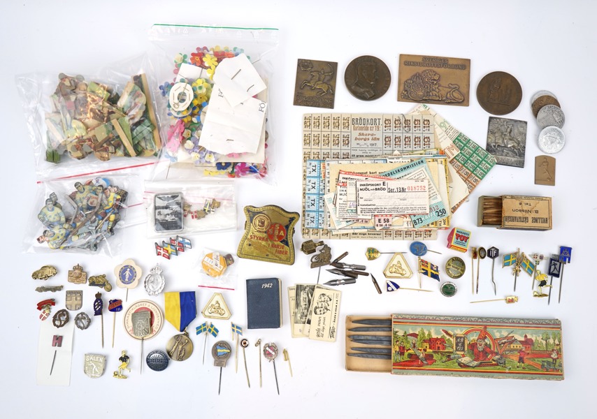 Pins, plaketter, ransoneringskort, majblommor m.m.