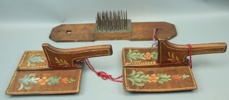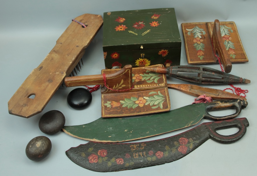Bilder Redskap för textilberedning, allmoge, trä/metall/las, 1800/1900-tal.