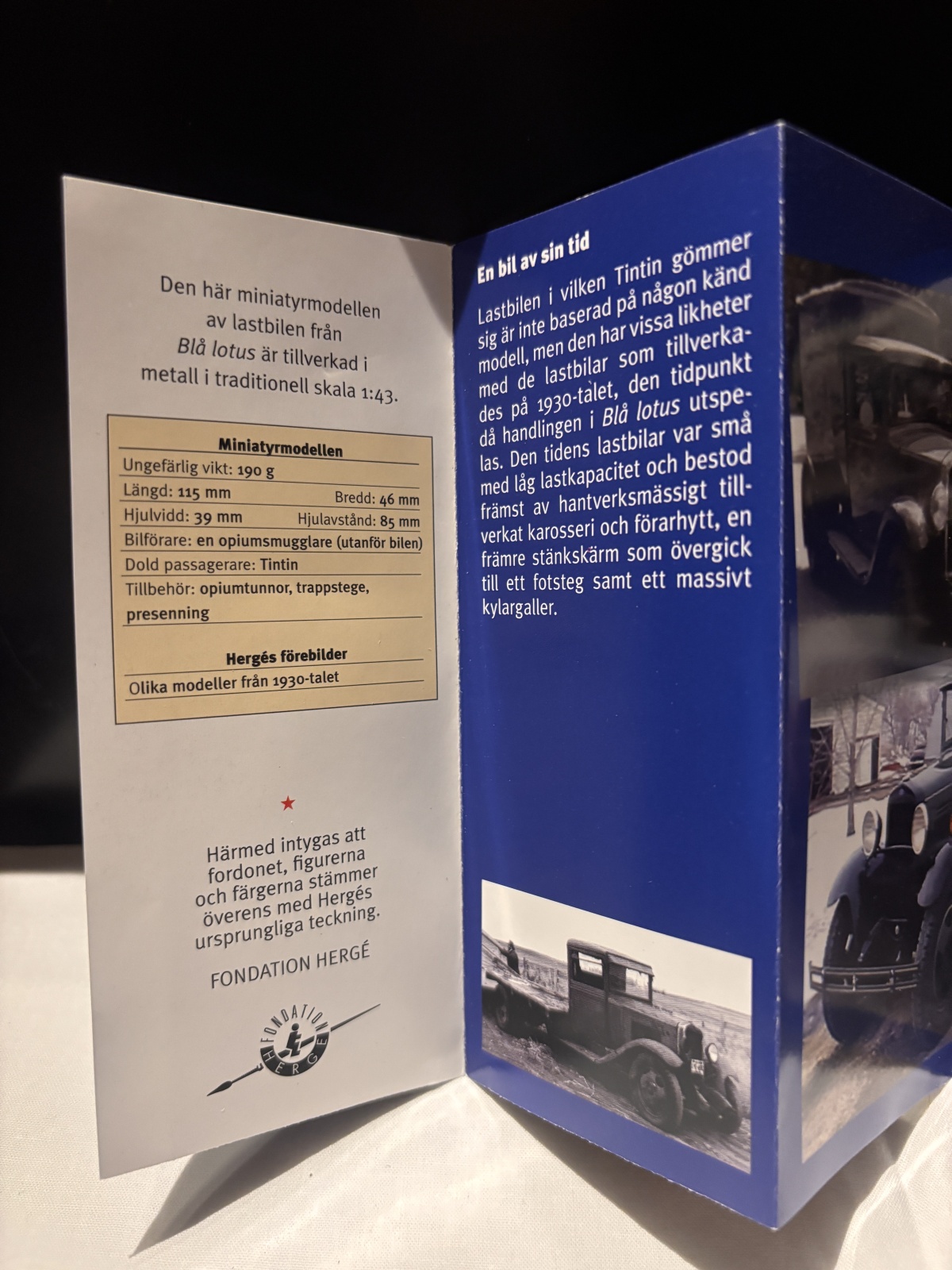 ???? Lastbil från Blå Lotus (1930-tal) – Den ikoniska lastbilen där Tintin gömmer sig. Modellen är utrustad med smugglarna i hytten, Tintin som dold passagerare, samt realistiska detaljer som trappsteg och presenning.