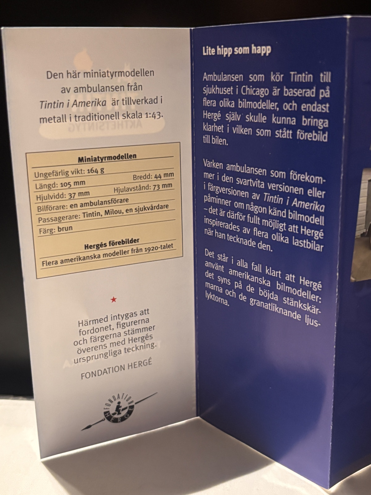 Ambulans från Tintin i Amerika (1920-tal) – Den klassiska ambulansen som kör Tintin till sjukhuset i Chicago. Baserad på flera amerikanska modeller från 1920-talet, komplett med Tintin, Milou och en sjukvårdare.