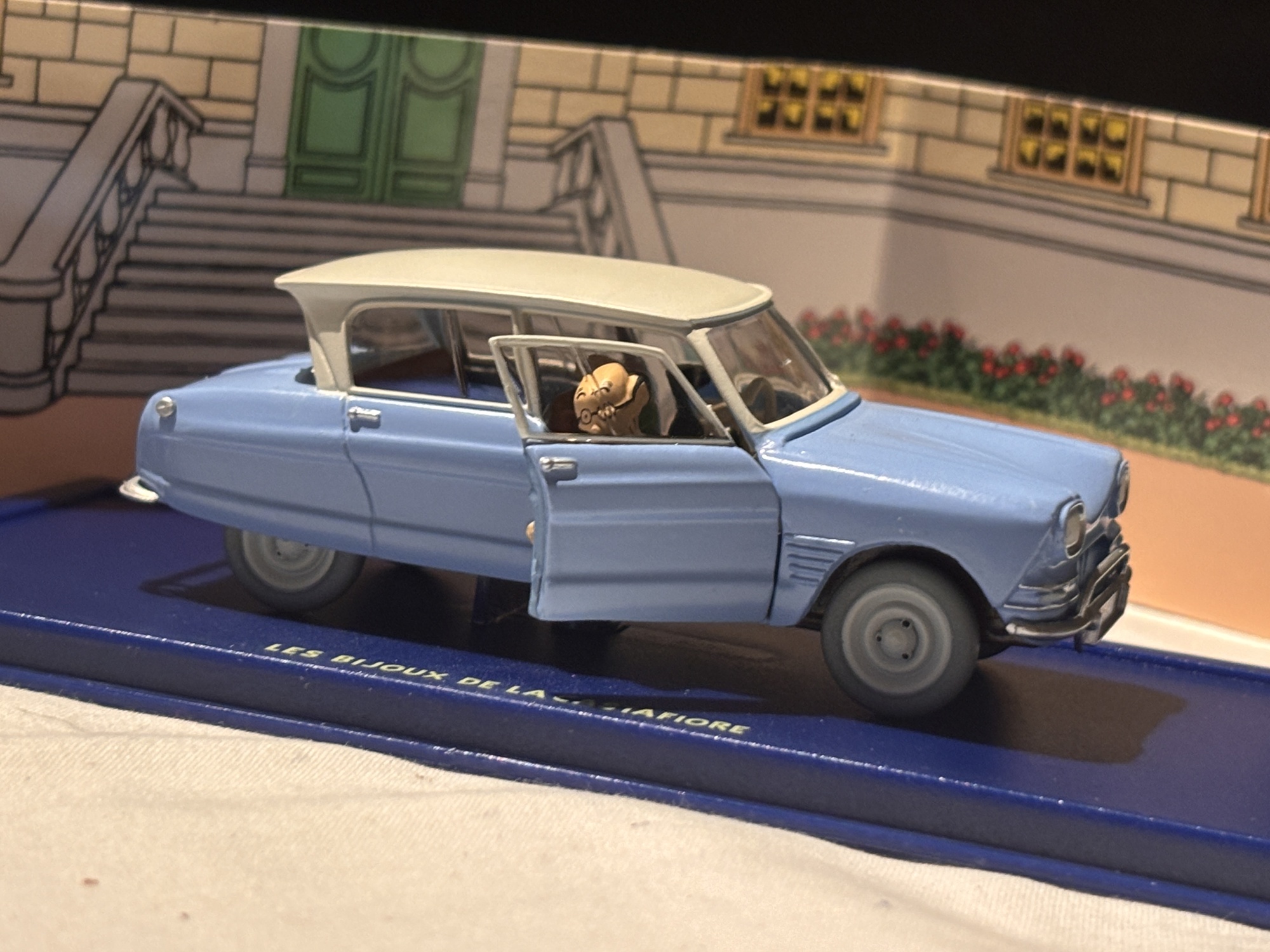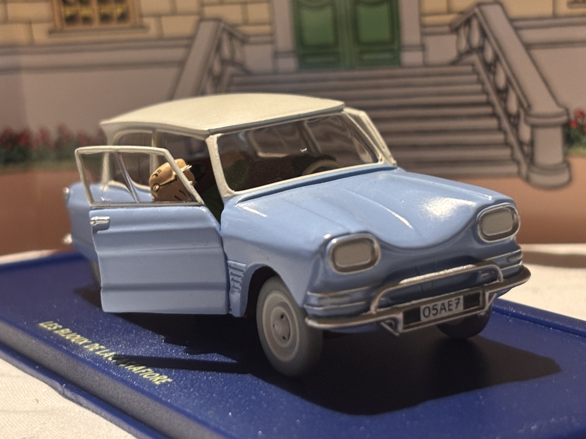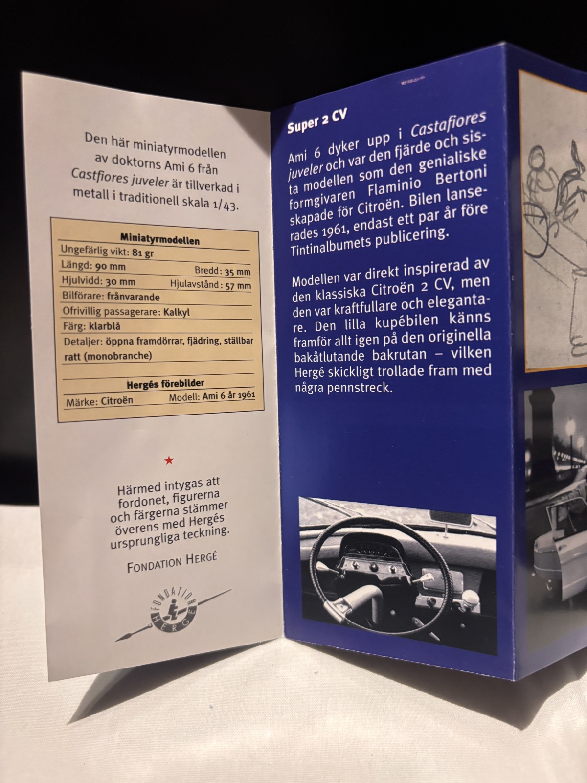 Citroën Ami 6 (1961) – Från Castafiores juveler! Doktorns klarblåa bil där Kalkyl ofrivilligt blir passagerare. En modell känd för sin eleganta och udda bakåtlutande bakruta – direkt inspirerad av 2CV.