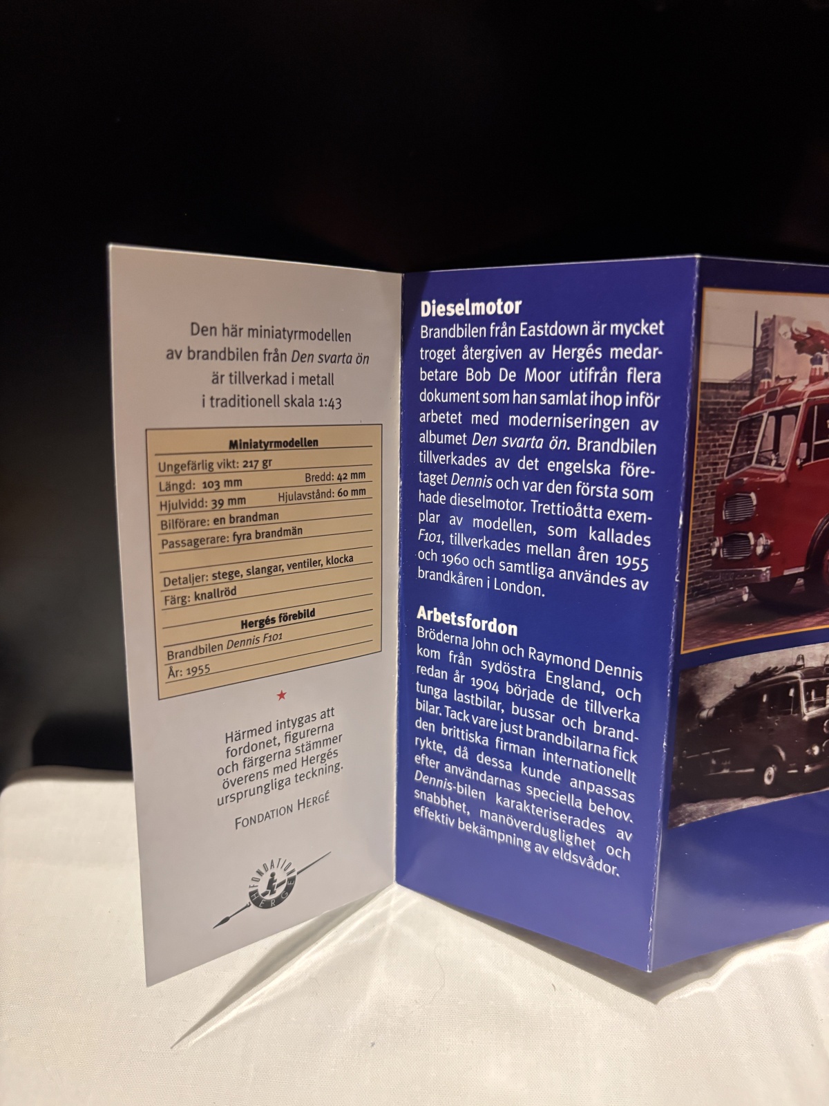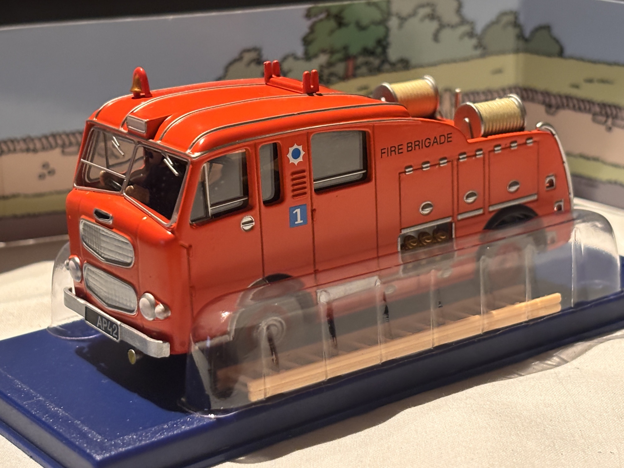 Dennis F101 Brandbil (1955) – Från Den svarta ön! En klassisk röd brandbil från det brittiska företaget Dennis, komplett med brandmän, stege, slangar, ventiler och klocka. Ett arbetsfordon troget återgivet från äventyret.