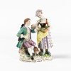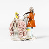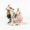 Två porslinsfiguriner föreställande kurtiserande samt spelande par, Dresden, Tyskland, höjd 21 cm och mindre