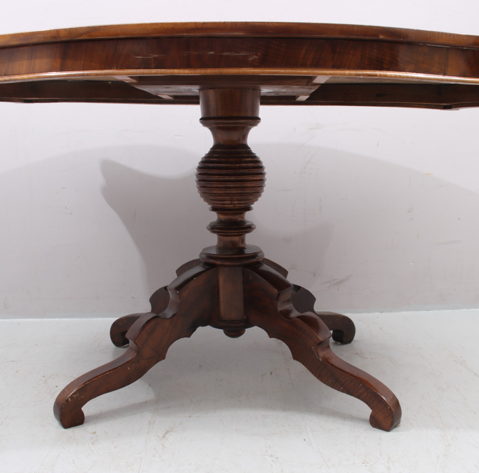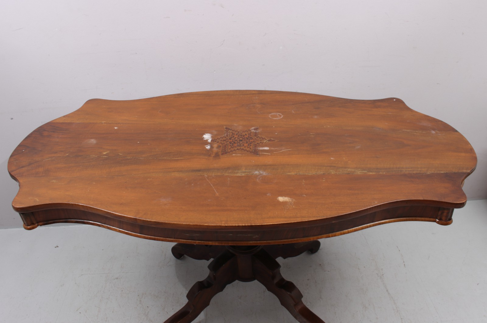 18,1900-tal, lövträ, skiva med intarsia, skiva med kraftigt slitage (se bilder), H.78, L.162, B.92 cm. (vån1)