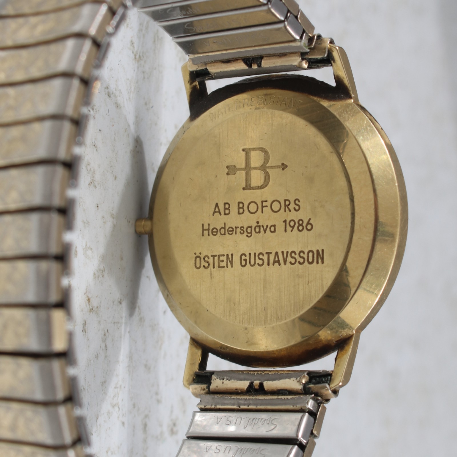Quarts, 14 eller 18 karat guld, armband i doublé, gångbar vid kontroll, boett med gåvogravyr, OBS! krona saknas, diameter 33,5 mm. (vån3)