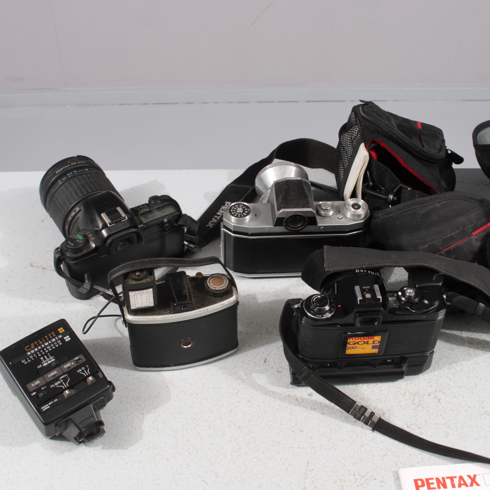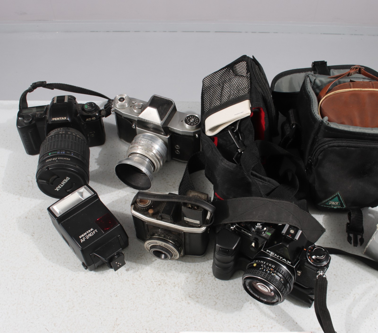 4 stycken, 1st Asahi Pentax ME, 1st Pentax MZ-10, 1st Praktica IV samt 1st Junior II,1st Pentax AF240FT blixt medföljer, ej testade (ingen garanti lämnas). (vån3)