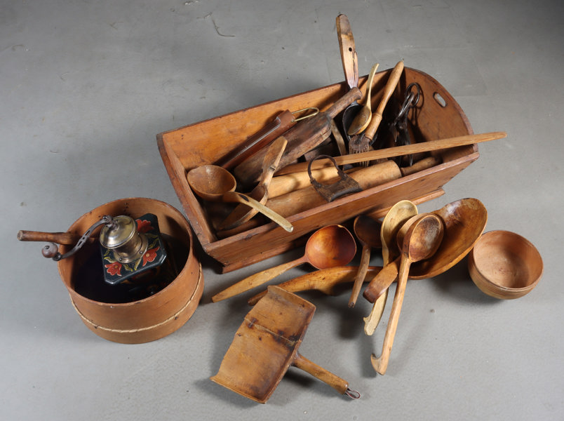 Kasse diverse bondegjenstander og verktĂžy. 1800 og 1900 tallet.