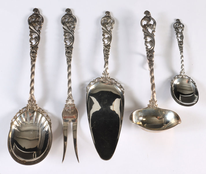 5 deler bestikk i sølv, Dobbel rokokko. L: 13-21,5 cm.