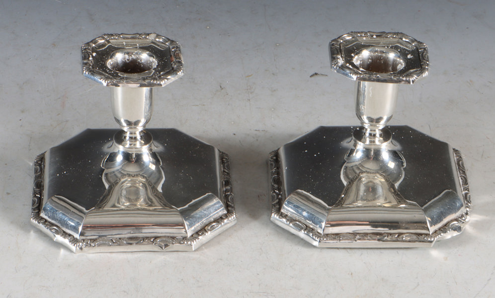 Et par lysestaker i sølv, H: 8 cm. Noe løs bunn.