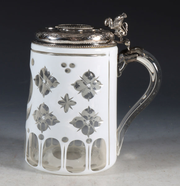 Rikt gravert lokk i sølv med eiernavn og datering 1740. Mester: Ole Jensen Stær - Skien. Krus i glass, ant. Hadeland. H: 21 cm. Et par små feil, ant. fra produksjonen.