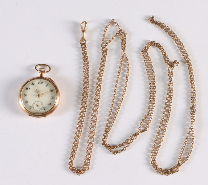 Budeie i gull med lenke i gull. L: 77 cm.(dobbel). Lenke ca. 21 gram.