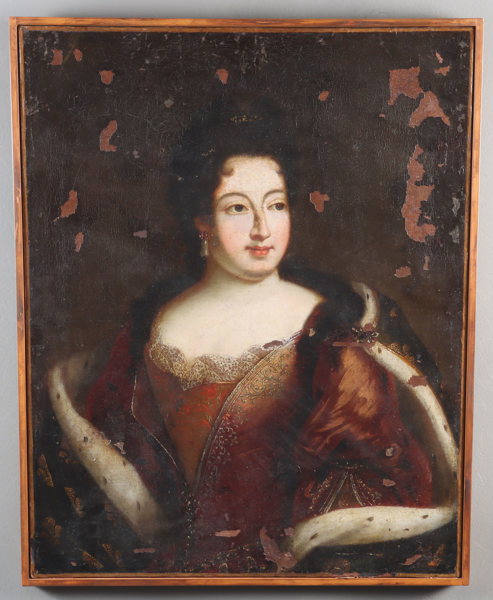 Usignert, tilskrevet Mignard: Portrett av kvinne, olje på lerret. 81x64 cm., mange avskallinger.