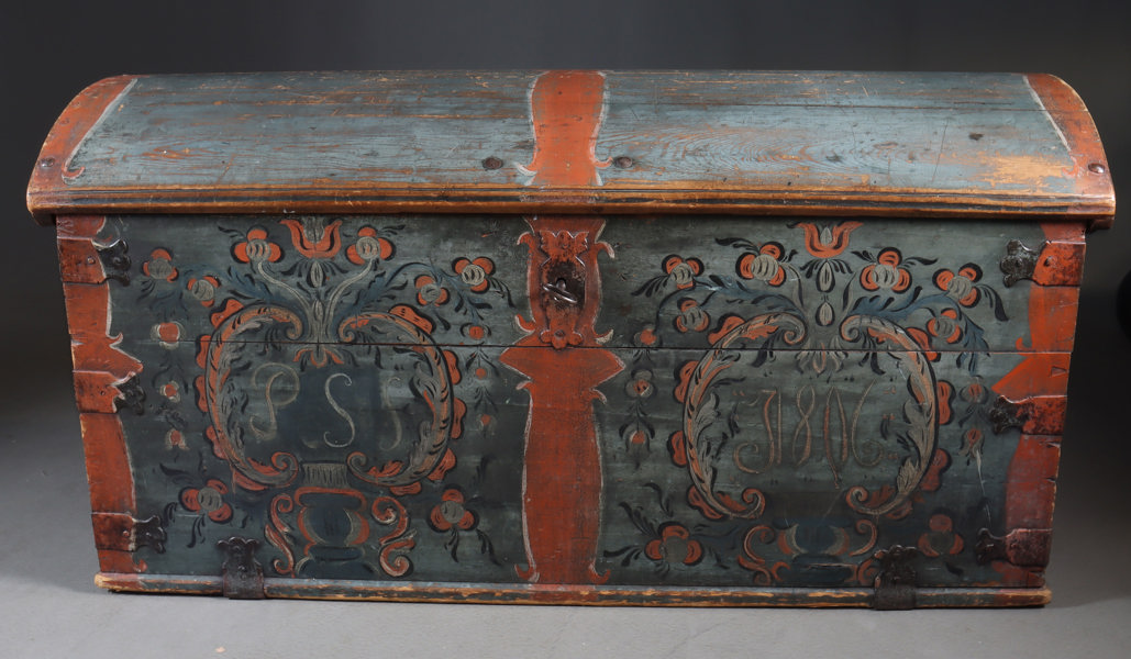 Rosemalt kiste med eierinitialer og datering 1806, Telemark. L: 130 cm.