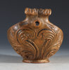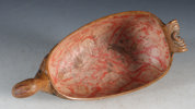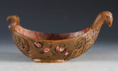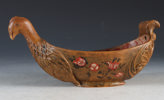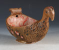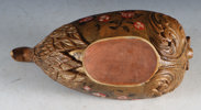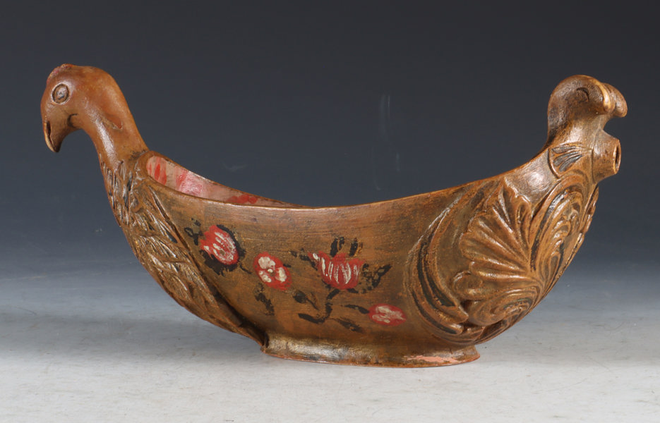 Rikt utskåret og malt ølhøne/trøys. Gudbrandsdalen, 17/1800 tallet. Rikt utskåret bryst med fjærdrakt og bak med helletut. Malt med gullaktig farge, rosemalt på begge sider og dekorert innvendig. L: 28 cm., H: 13 cm.