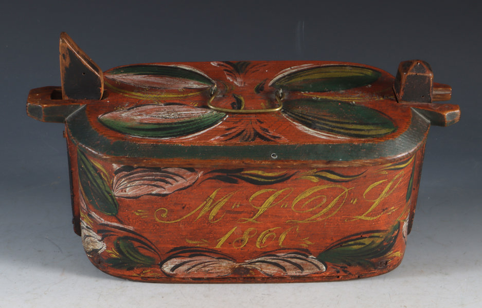 Rosemalt tine med eierinitialer og dat. 1860. L: 31 cm.