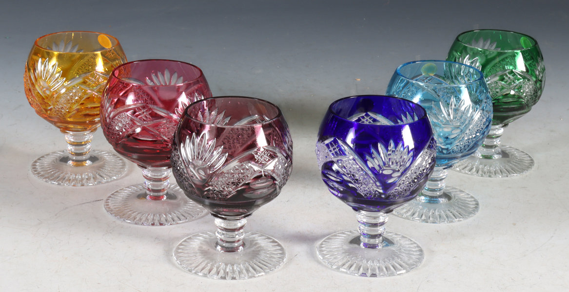 6 likørglass med farget klokke, Bømisk type. H: 8 cm.