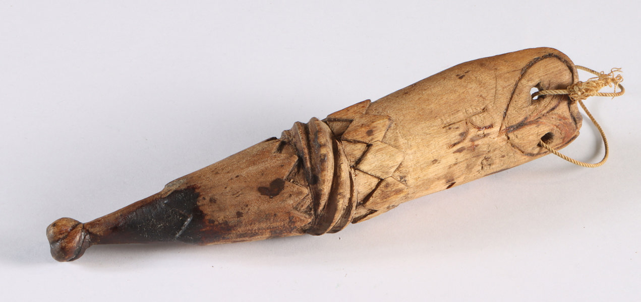 Rikt utskåret seilmakerhus i tre, 17/1800 tallet. L: 17 cm.