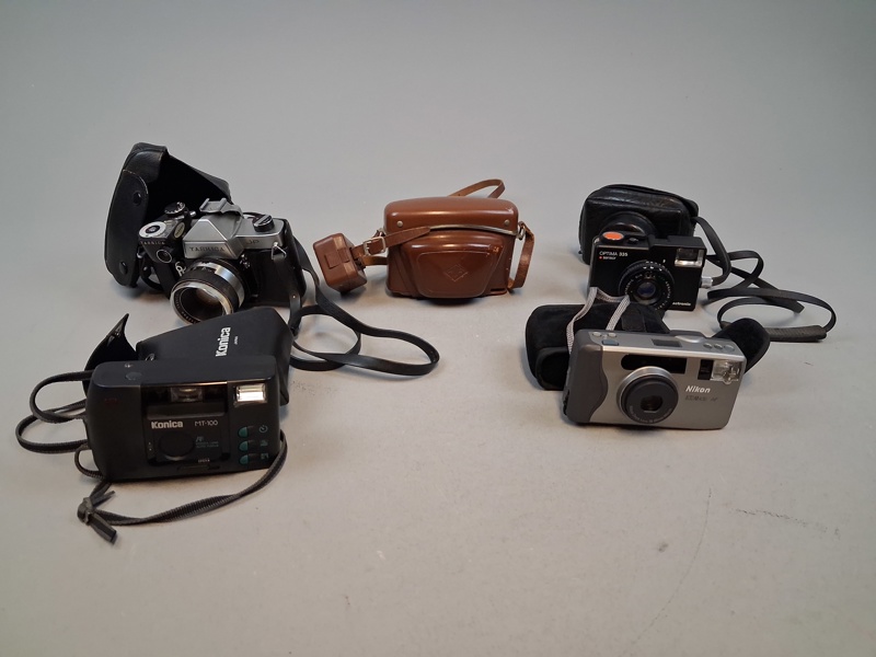 Diverse analoga kameror. Bl.a Yashica, Agfa, Nikon m.m.