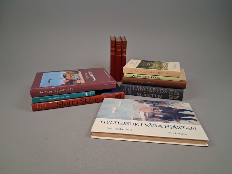 Diverse böcker. Bl.a Slott i skåne, Långaryds släkten, Hylte.
