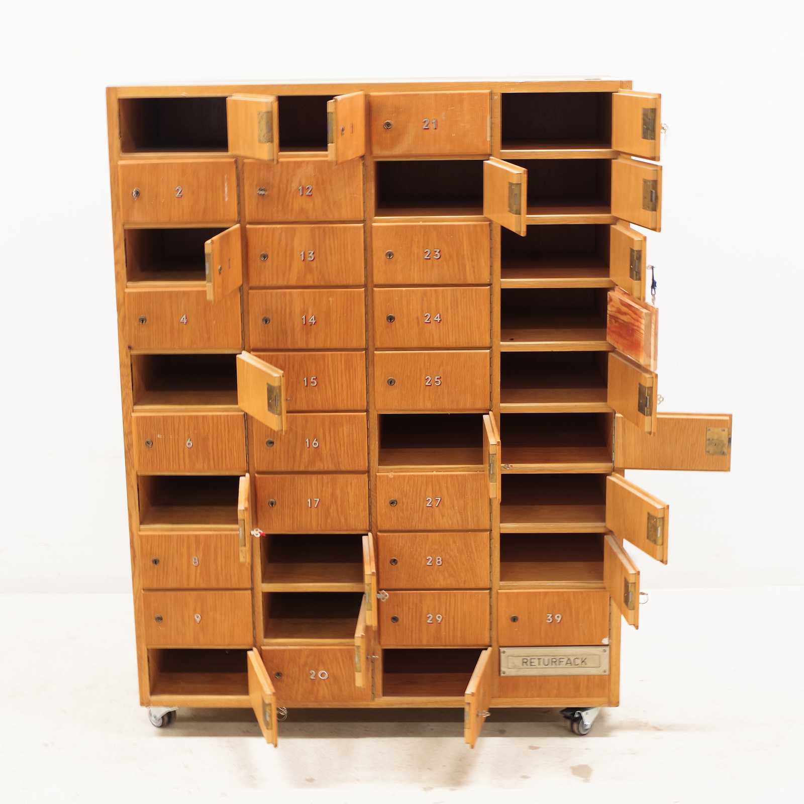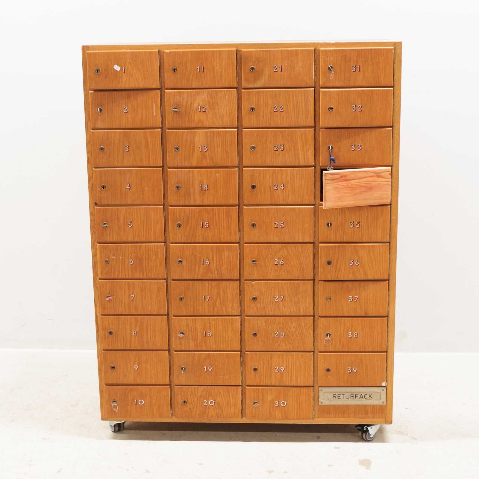 Auktioner    POSTFACK på hjul, 40 fack, 1900-tal, H: 136x 101x 45cm (slitage, flera nycklar saknas, flera fack låsta)