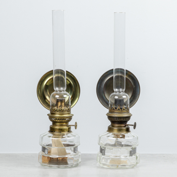 Väggfotogenlampor, 2 st snarlika, glas, mässing, 1900-talets första del