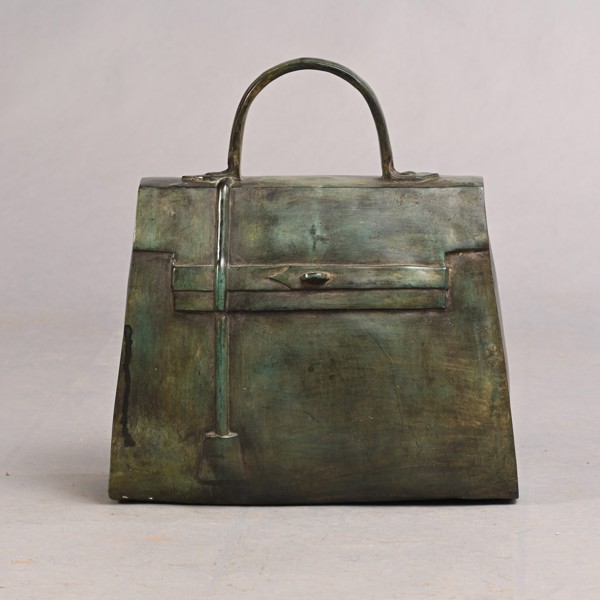 I form av väska, grönpatinerad brons, märkt undertill RR Sweden, höjd 50, längd 38 cm