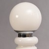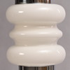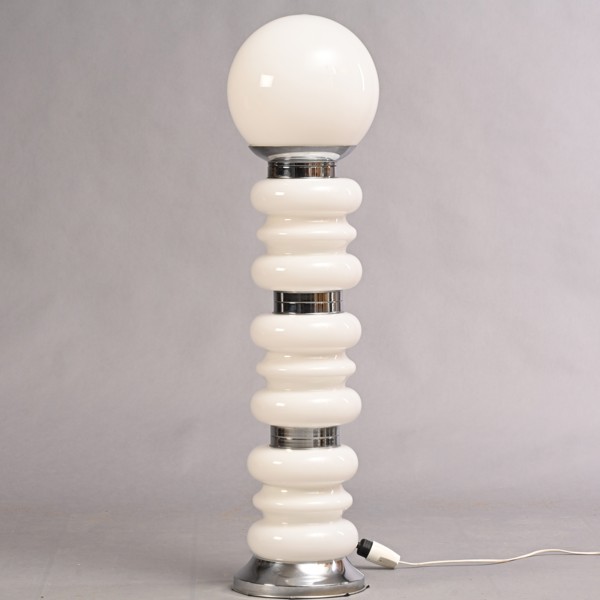 Tillverad av Mazzega, stomme i kromad metall samt vit glasmassa, går att tända i två sektioner, höjd 115 cm