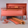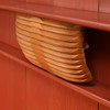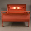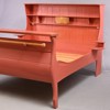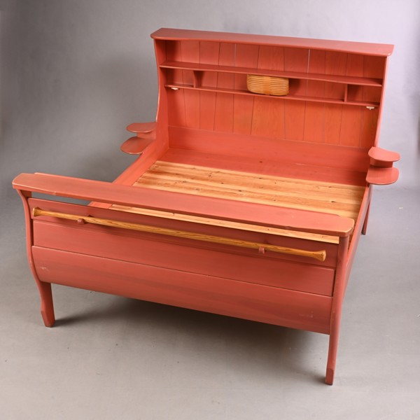Dubbelsäng, betsad furu, designad 1967, brännmärkt CM, huvudända med hyllplan integrerade sängbord och belysning, fotända med krokar och upphängningsanordning, demonterbar, höjd 138, innermått, ca 200x165 cm