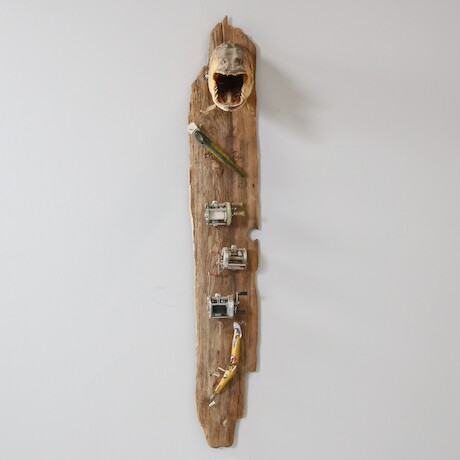 Fiskecollage på drivved med bla gäddhuvud, H=110