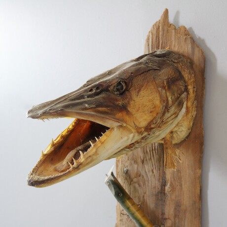 Bilder Fiskecollage på drivved med bla gäddhuvud, H=110