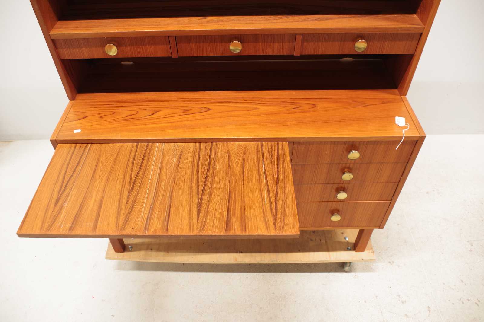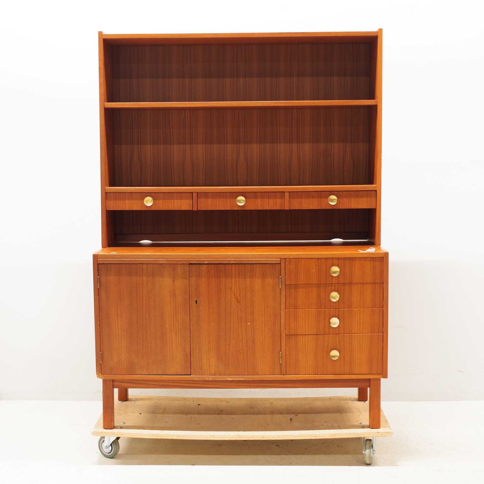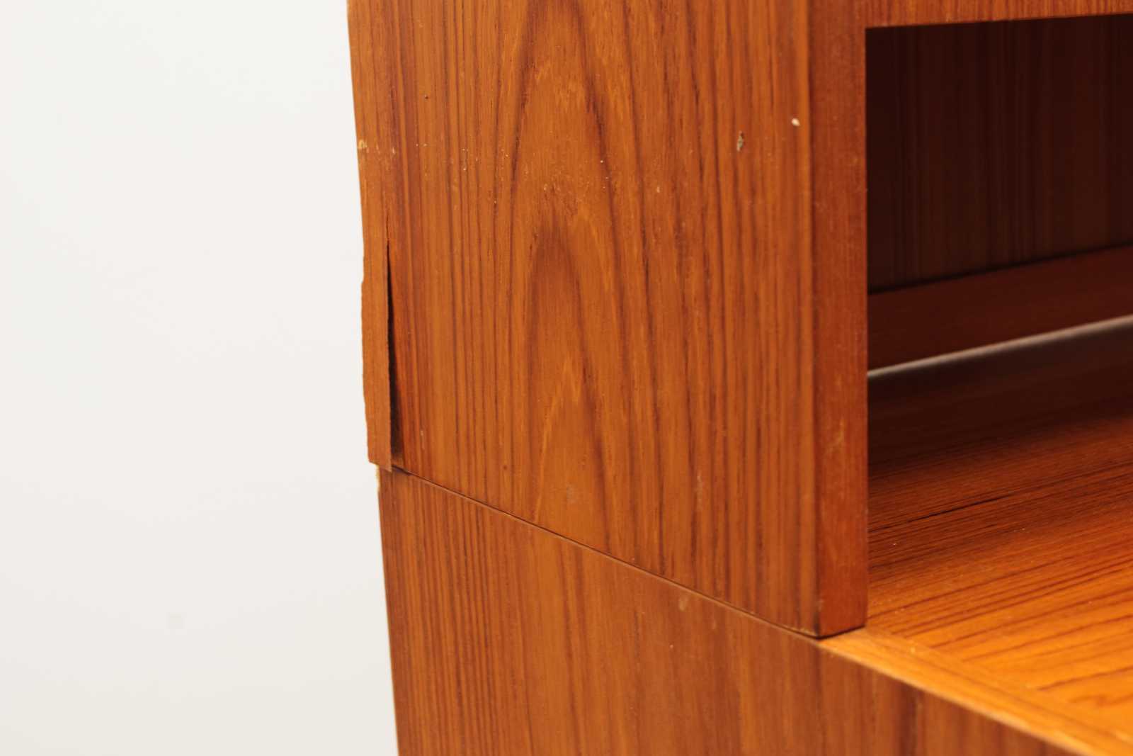 Auktioner    BOKHYLLA med skåp, lådor & utdragbar skiva, fanerat i teak, 1900 talets mitt, 2 delar. H:160x 115x 45cm (bruksslitage, revor förekommer, lådor lite tröga att dra ut)
