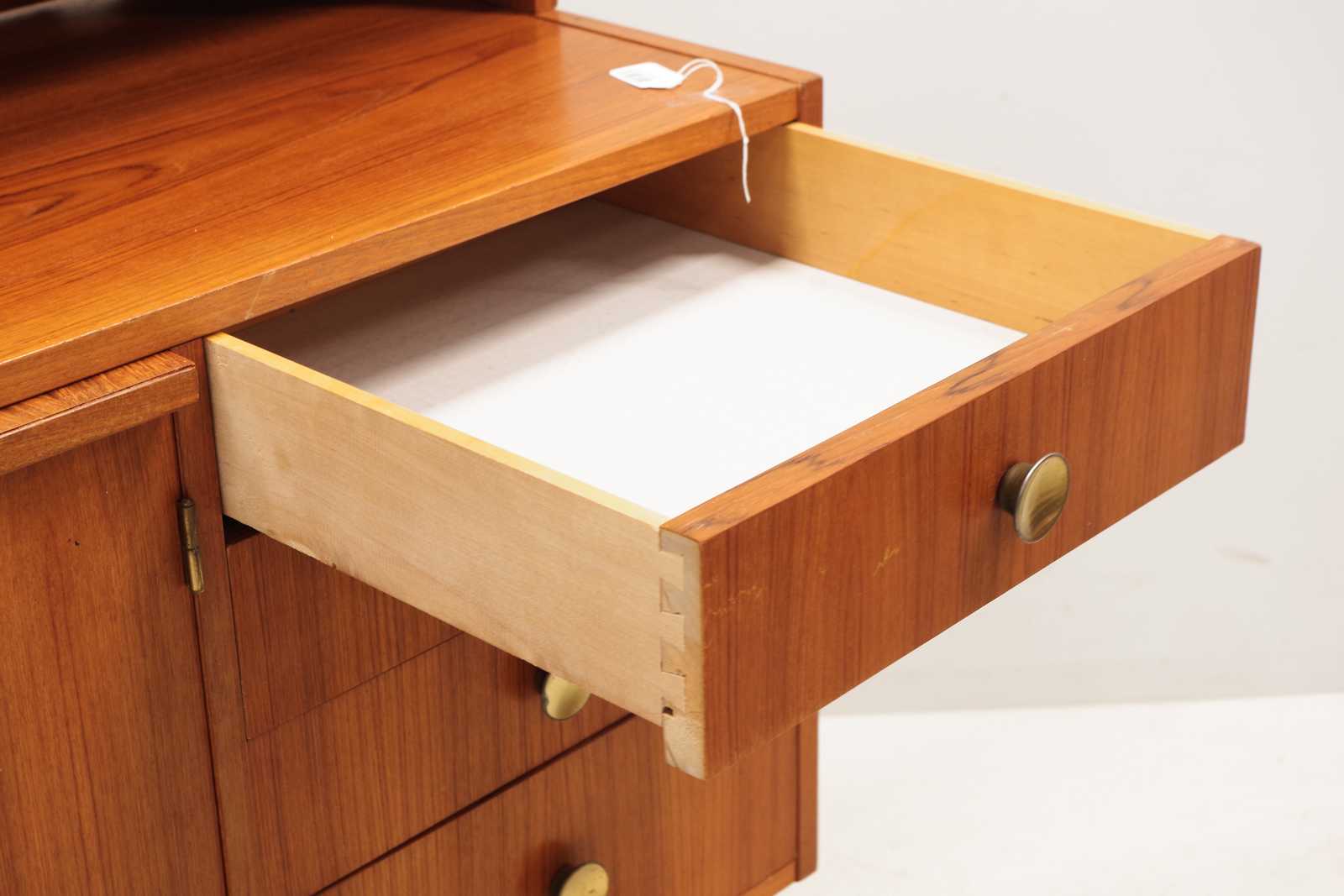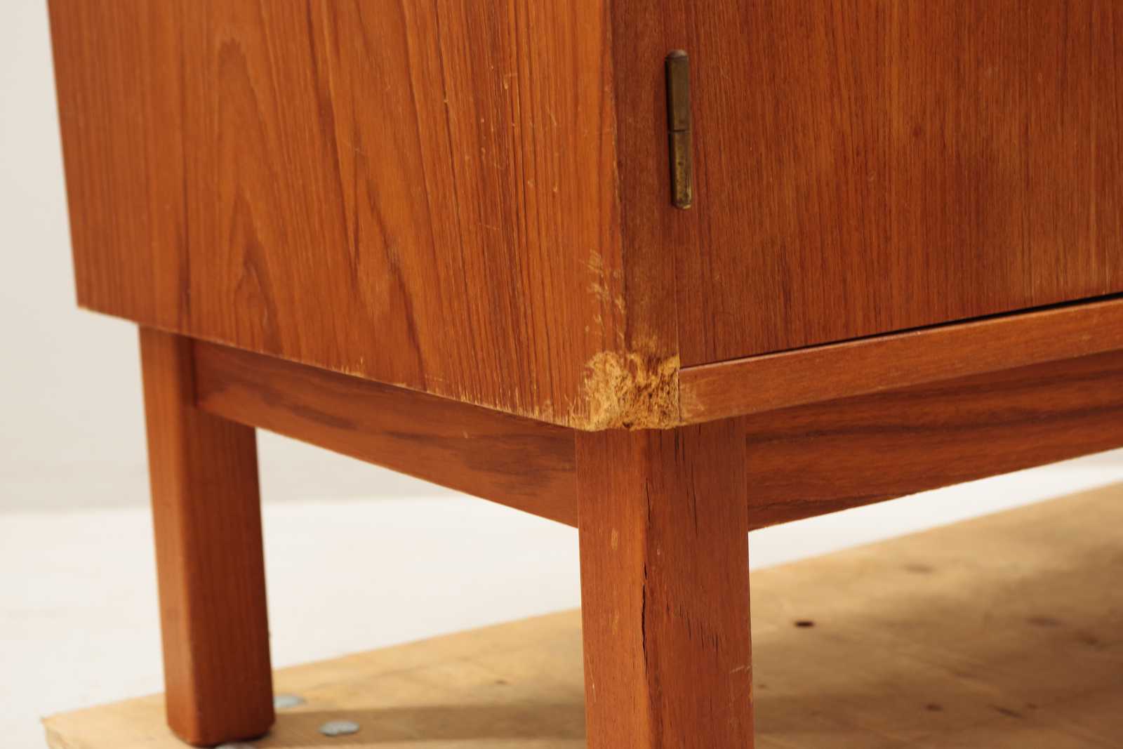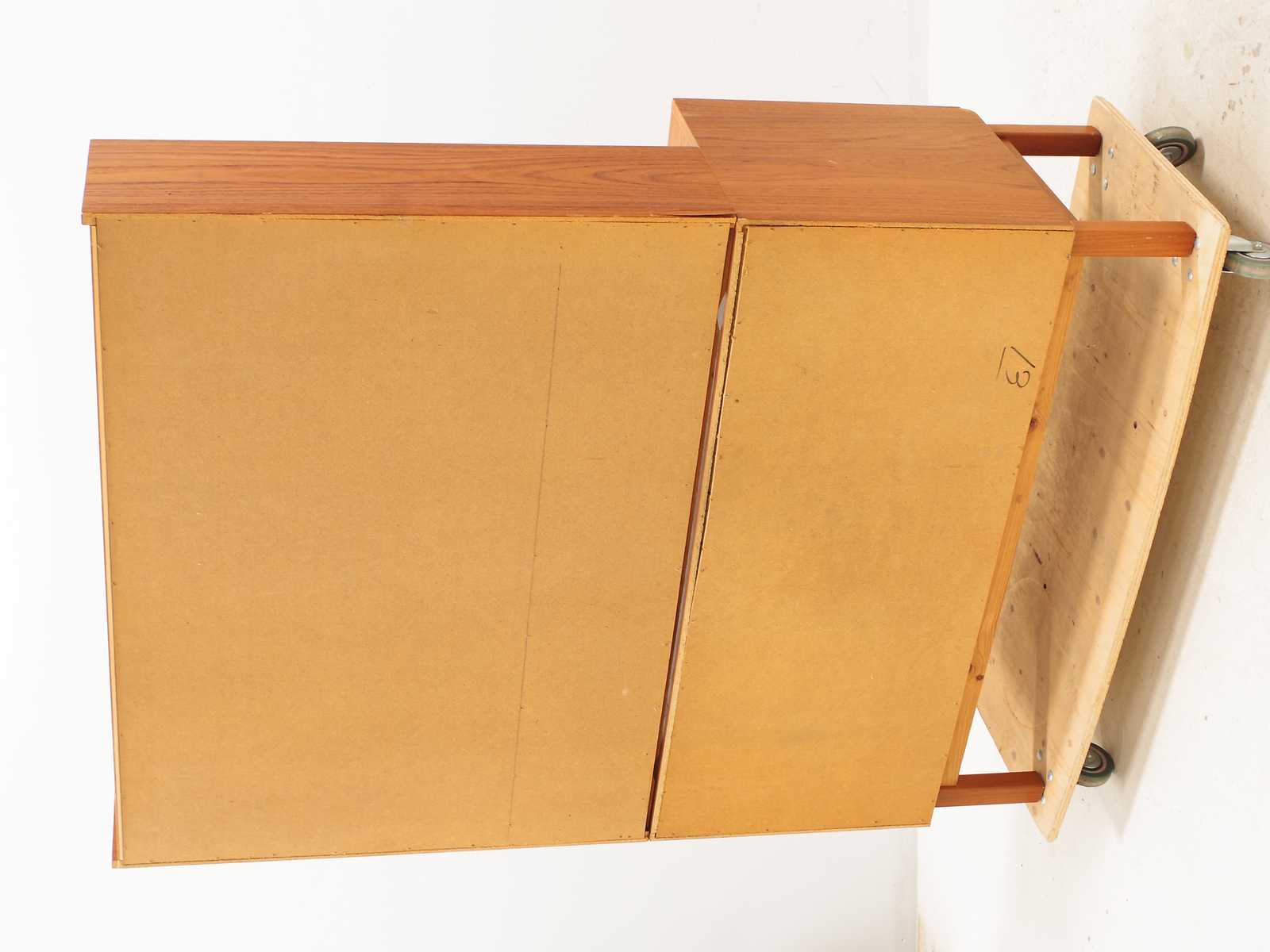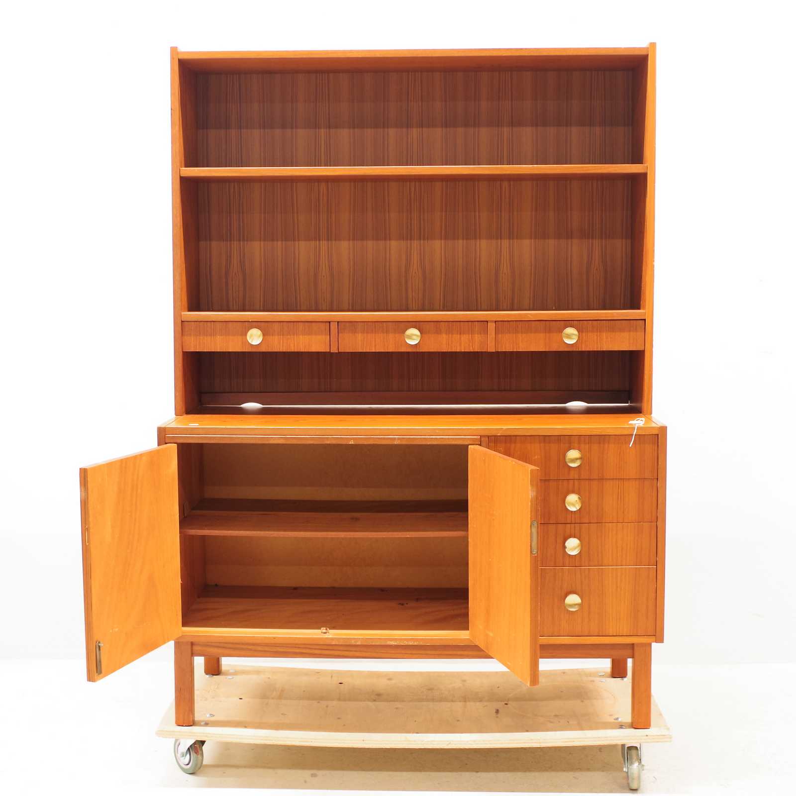 Auktioner    BOKHYLLA med skåp, lådor & utdragbar skiva, fanerat i teak, 1900 talets mitt, 2 delar. H:160x 115x 45cm (bruksslitage, revor förekommer, lådor lite tröga att dra ut)