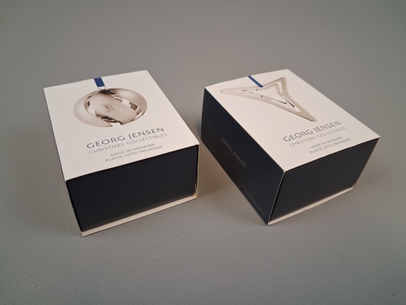 Bilder GEORGE JENSEN, 2 Julgranshänge, Palladium pläterade, originalaskar.