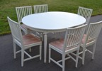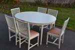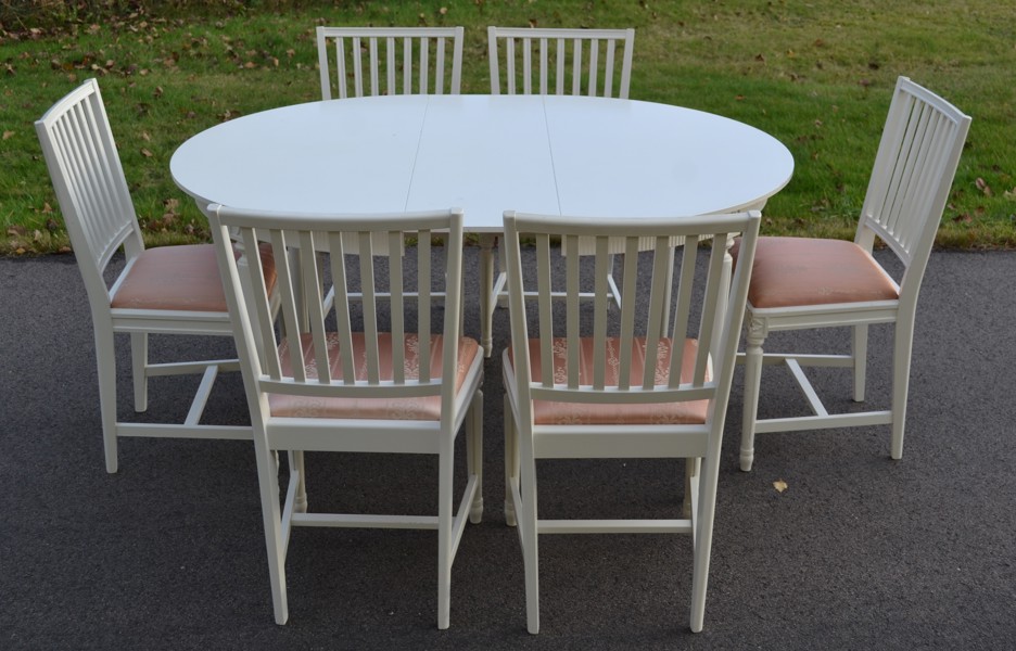 Bilder Matgrupp. Gustaviansk stil, "Axet", 1900-talet, bord med en iläggsskiva & 6 stolar.