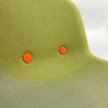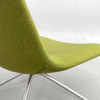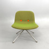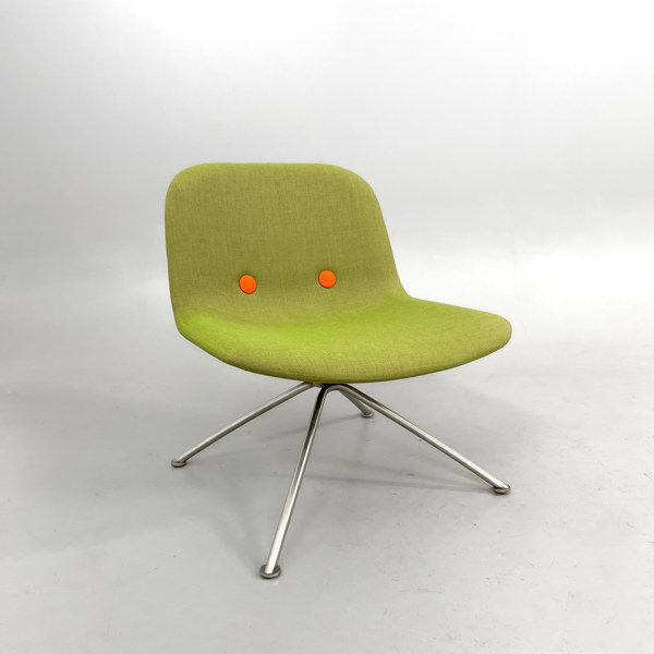 Fåtölj från danska Erik Jörgensen. Modellen Eyes EJ3-X formgiven av Foersom & Hiort-Lorenzen. Klädd i ett grönt tyg med dekorativa knappar i orange tyg. Snurrstativ i polerat stål