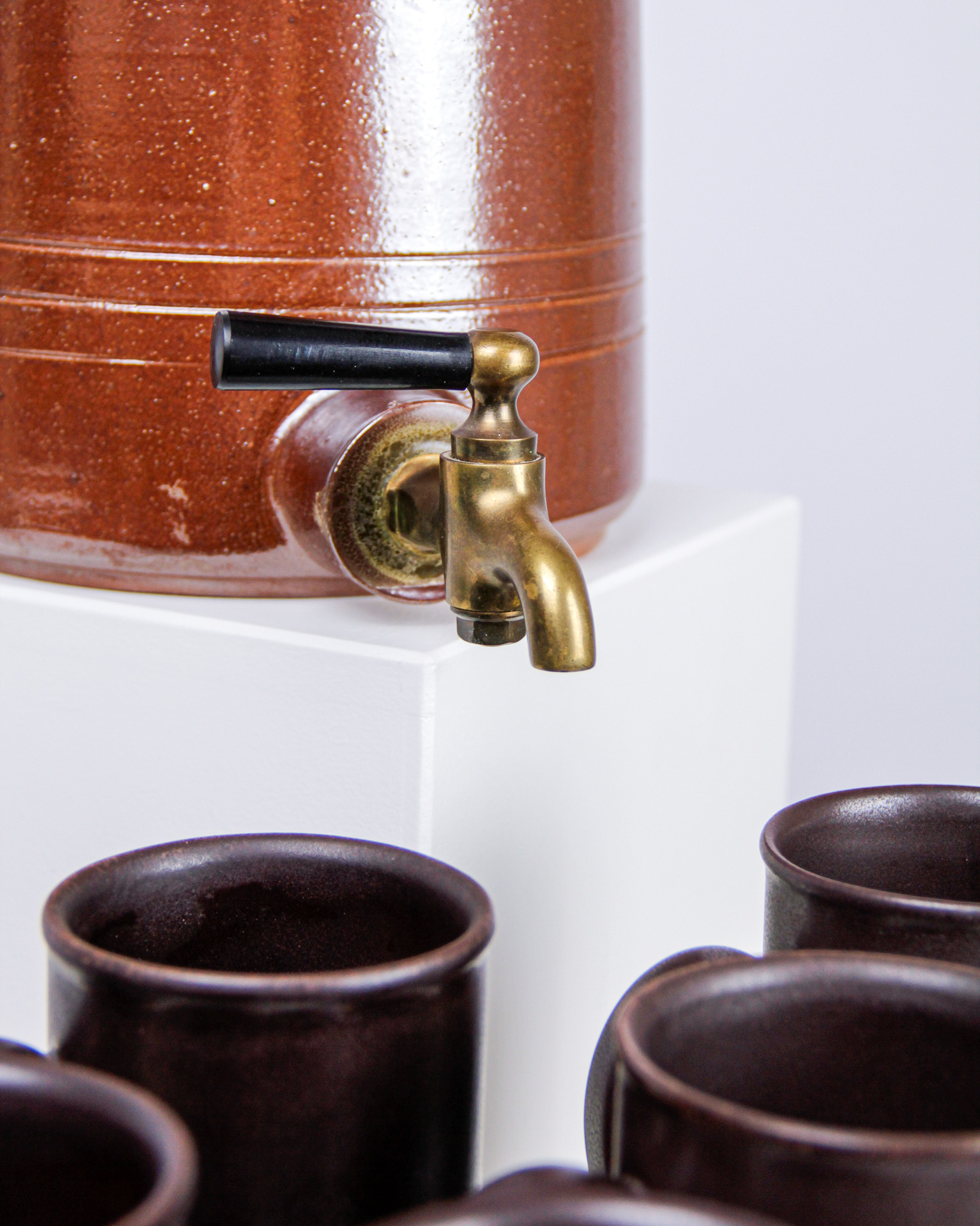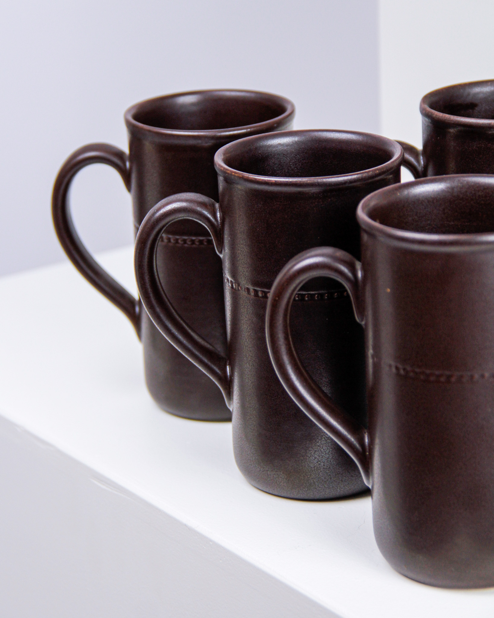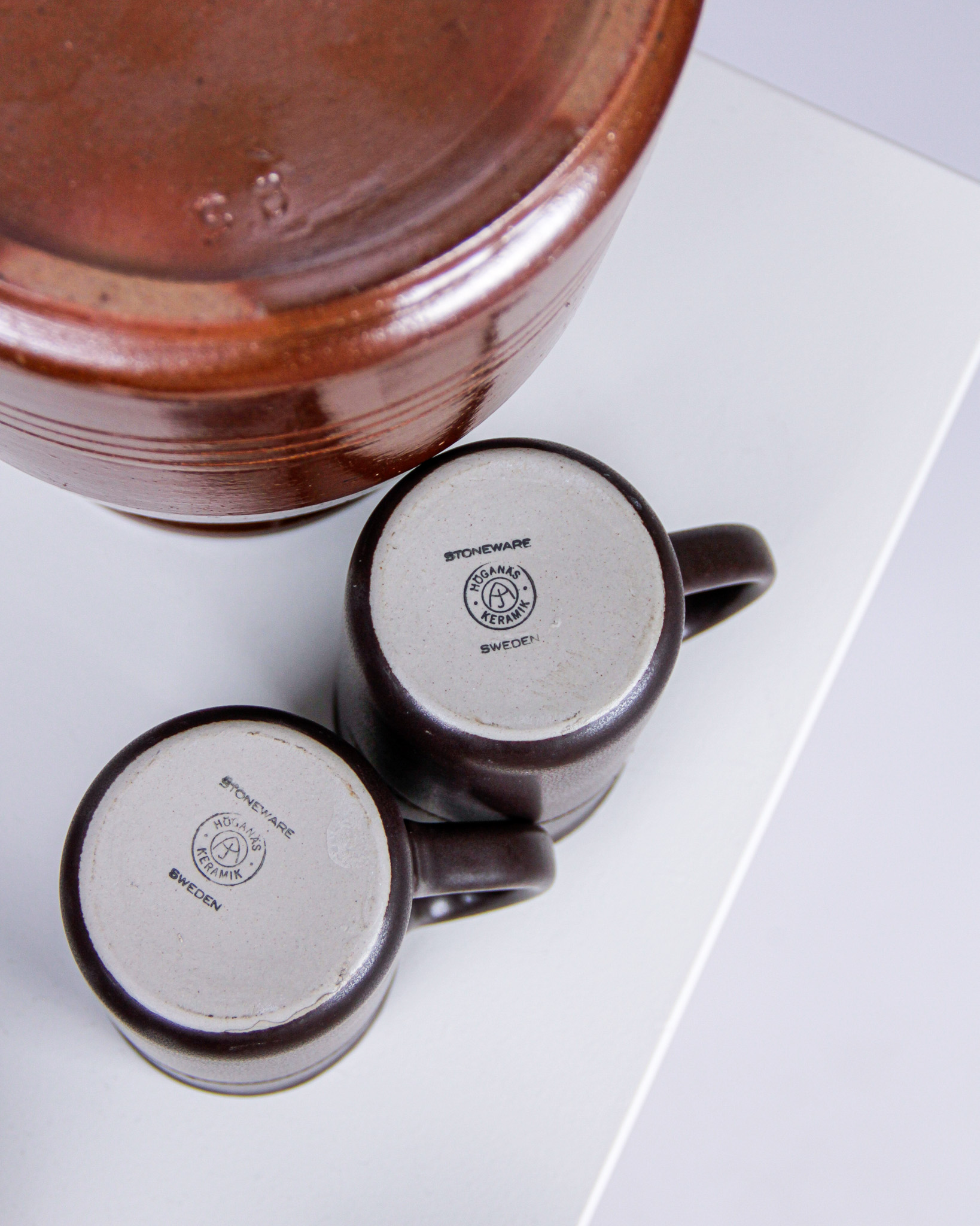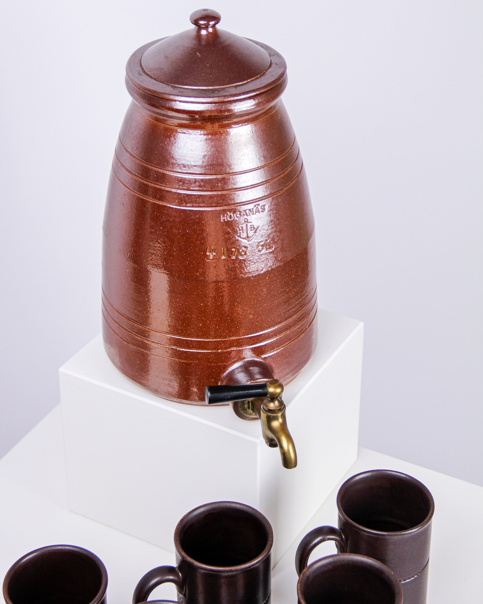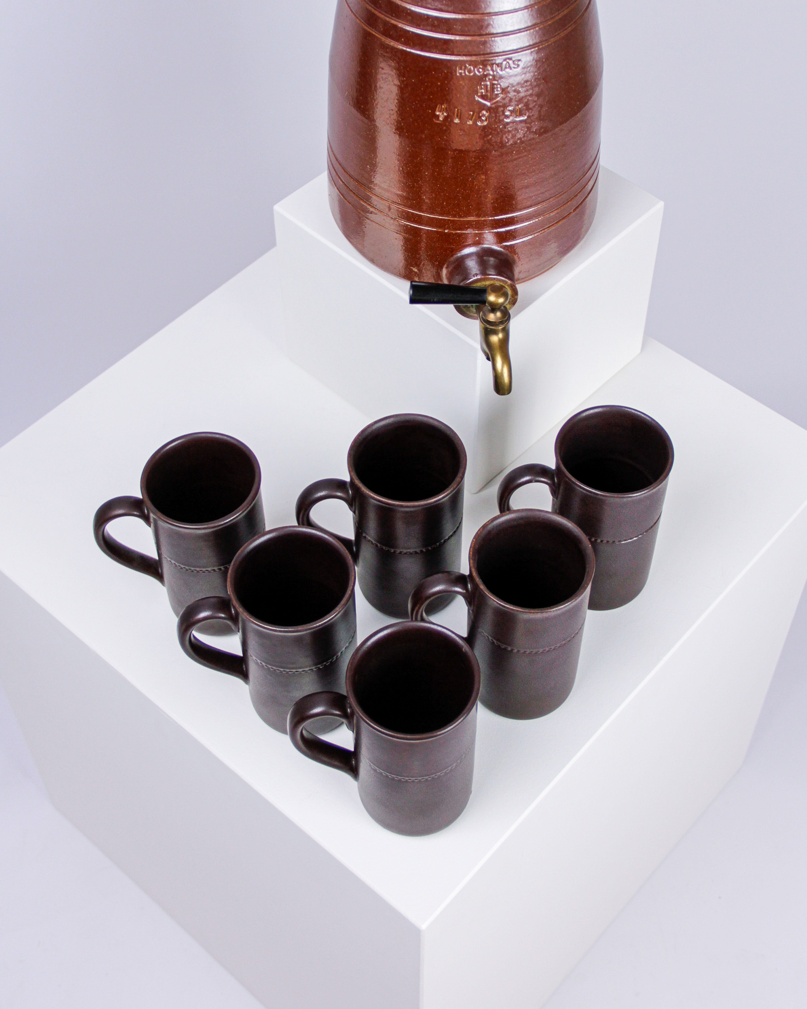 Tappkrus och 6 st muggar, glaserat stengods, Höganäs Keramik (Medieval Modern)